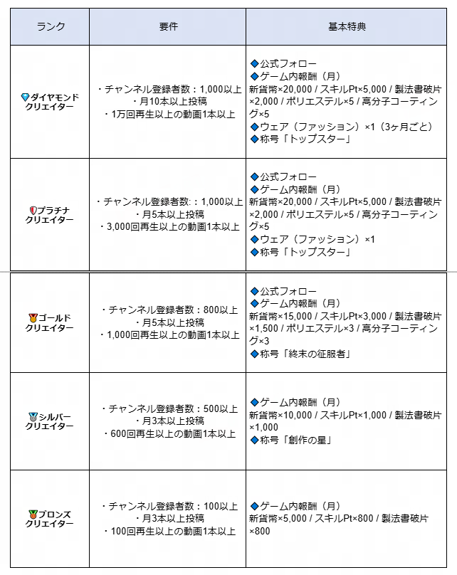 昇格:毎月、データを審査し、条件を満たしたクリエイターを自動的に昇格させていただきます。条件を満たしているのに昇格していない場合は、お気軽に運営までお問い合わせください。